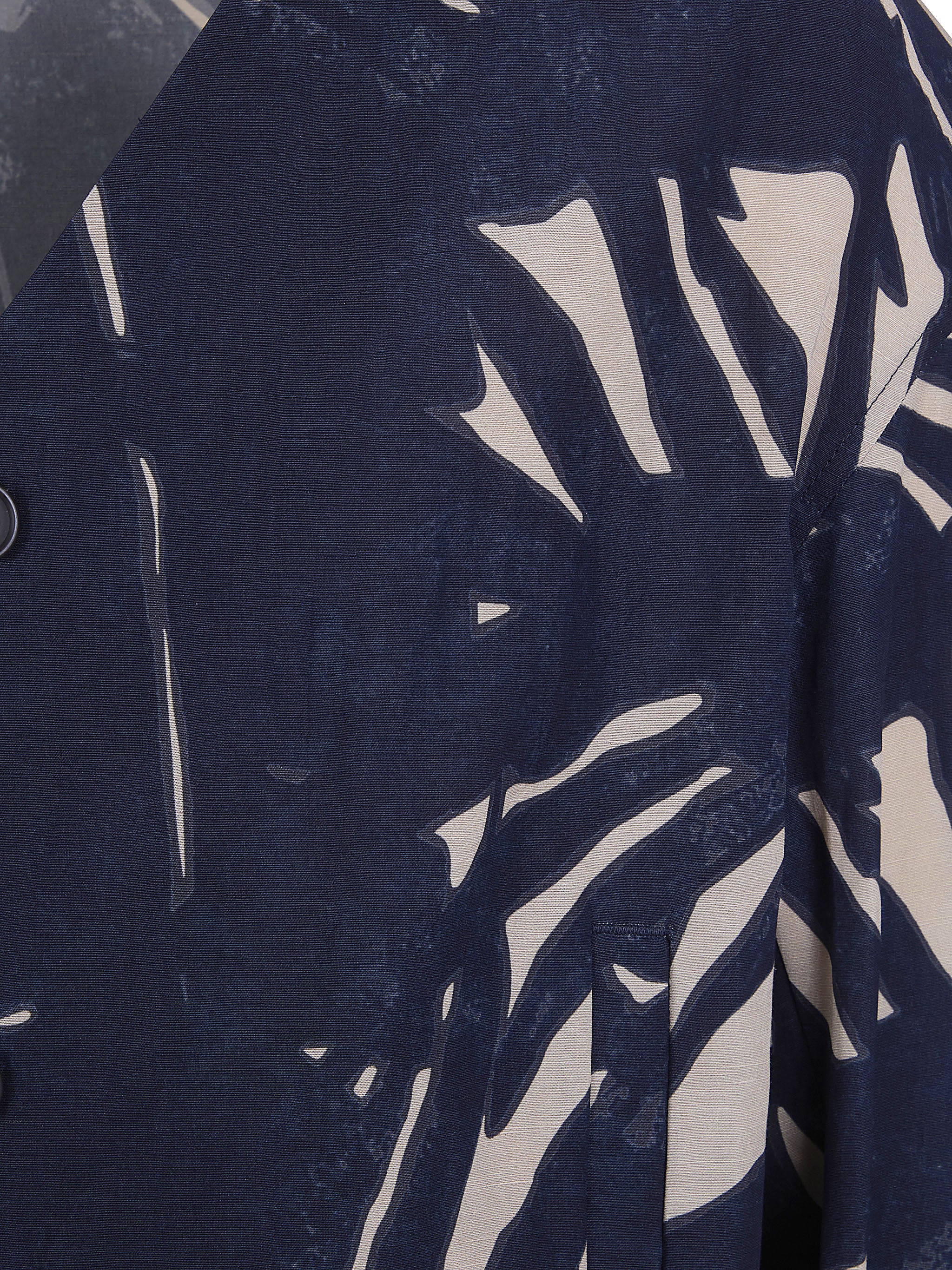This stunning Emporio Armani Blouson Jacket brings effortless sophistication to your casual wardrobe. Featuring a striking navy base adorned with an elegant tropical palm print in soft cream tones, this bomber-style jacket is crafted from a luxurious blend of viscose, linen, and cotton for exceptional comfort and breathability.
