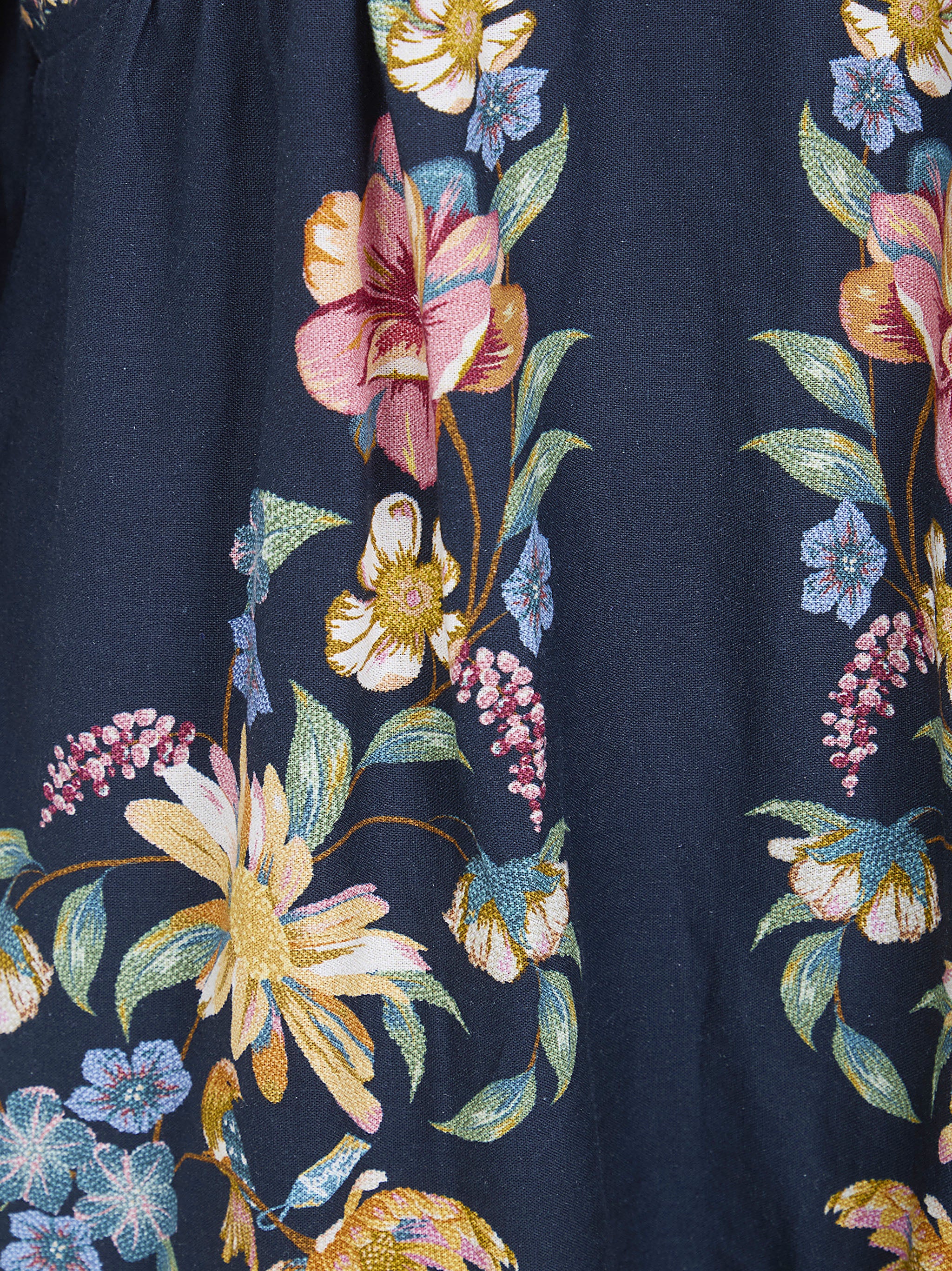 Embrace bohemian elegance with this stunning mini dress from FARM Rio. Featuring intricate floral embroidery in vibrant pink, yellow, and blue hues against a rich navy backdrop, this long-sleeve dress is a true work of art.