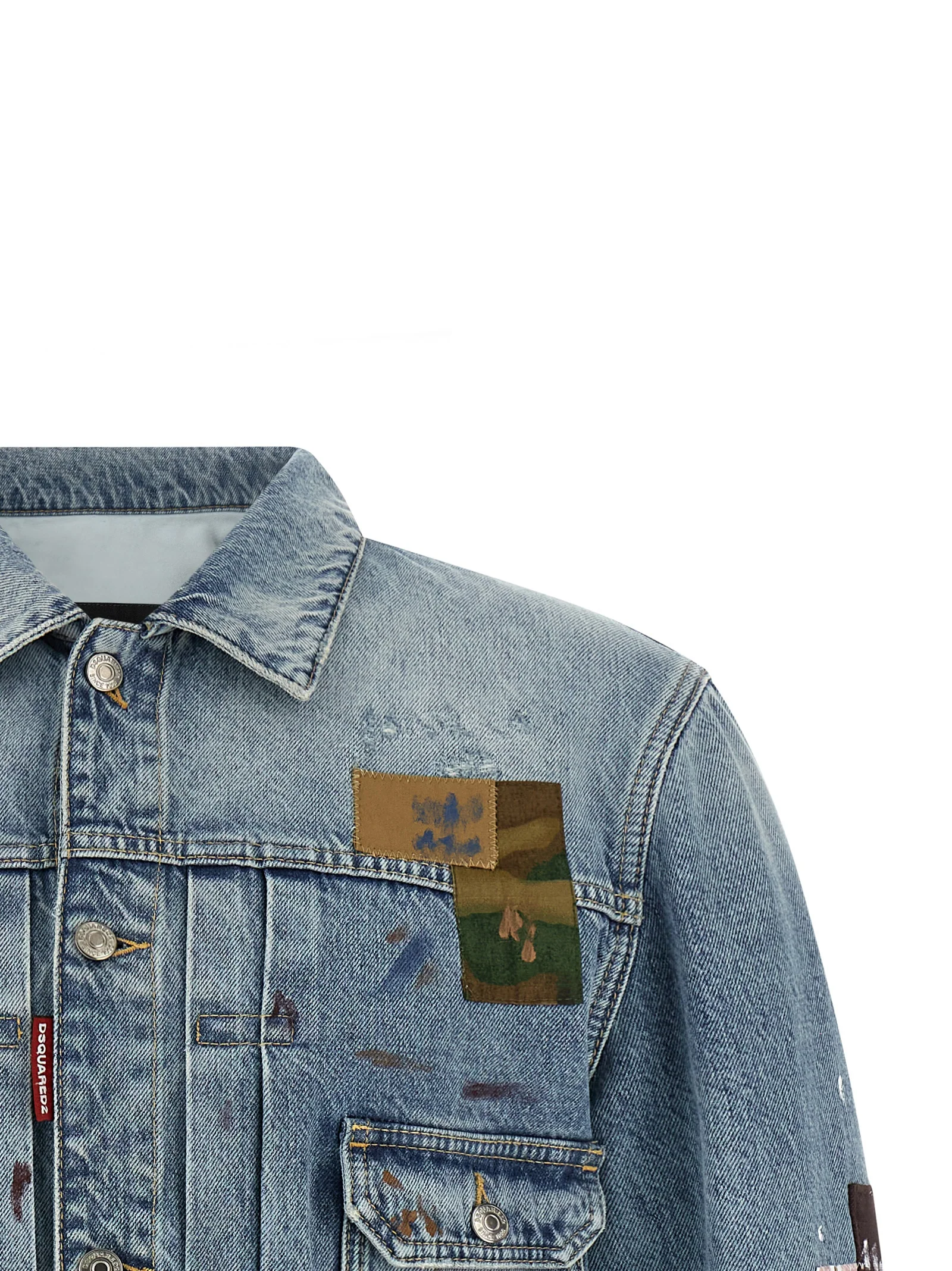 Introducing the 'Rebel' jacket by DSQUARED2 – a statement piece that embodies edgy, contemporary style. This destroyed-effect stone-washed cotton denim jacket features distinctive paint stains and front patchwork details that give it an authentic, lived-in aesthetic.